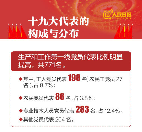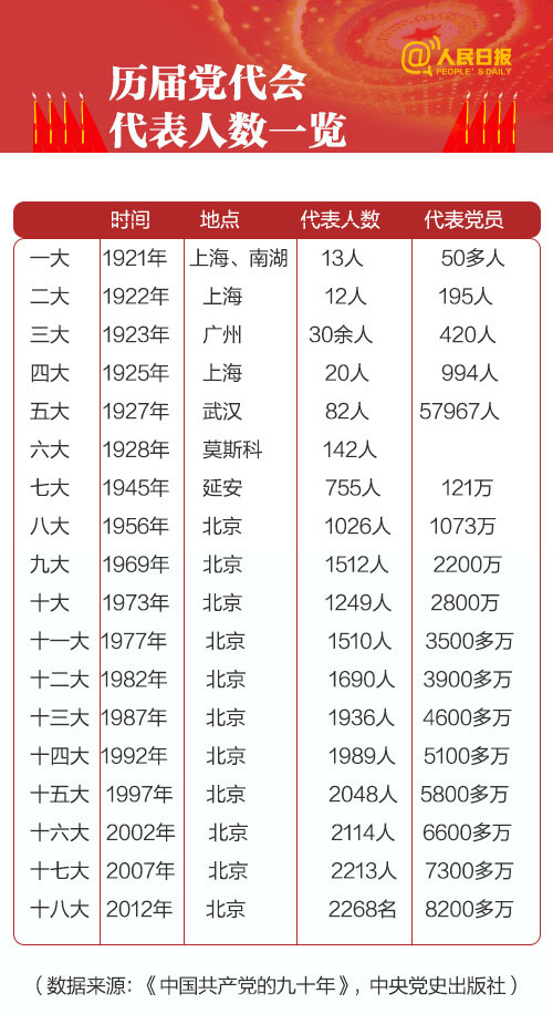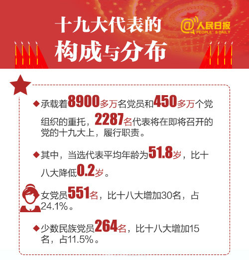 即将召开的十九大将选举产生新一届中央委员会。你知道党代会几年开一次,都有哪些职权吗?承载8900多万党员重托的2287名代表,他们的构成和分布都有啥特点?从一大到十九大,历届党代会代表人数如何变化?8图带你了解十九大。